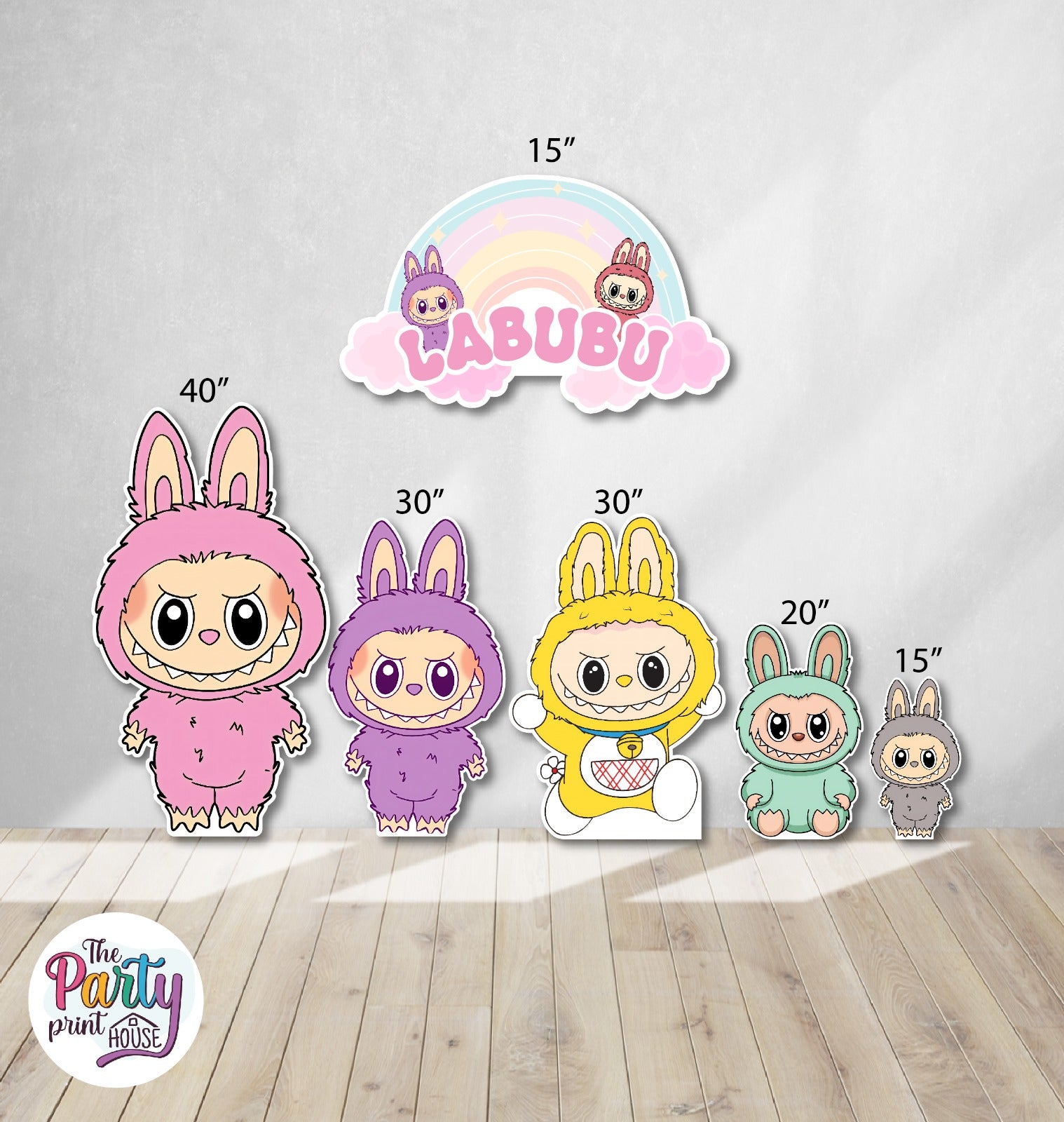 This props set features a variety of Labubu character cutouts in multiple sizes, along with a sweet Labubu name sign with a pastel rainbow designβ€”perfect for filling spaces, styling dessert tables 🍰, and creating fun photo moments πŸ“Έ.
